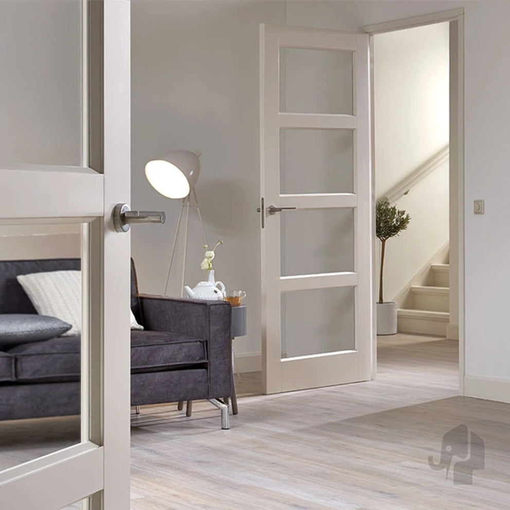 De tijdloze binnendeur Jersey geeft ieder interieur nóg meer cachet. De Austria binnendeur Jersey is een stijlvolle 4-ruits luxe glasdeur uit de serie Balance. De binnendeur heeft robuuste stijlen en dorpels uitgevoerd met het luxe facetprofiel. De Jersey is beschikbaar in verschillende maten en verkrijgbaar als stompe - en opdekdeur. Alle Balance binnendeuren zijn FSC gecertificeerd, voorzien van een KOMO keurmerk en worden geleverd met 12 jaar garantie.