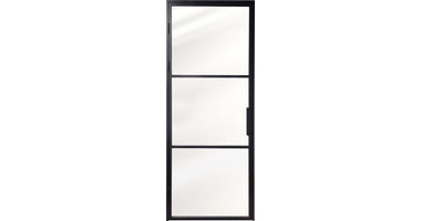 De deur is voorzien van fabrieksmatig gemonteerd blank gehard 8 mm glas. Het glas is in de zwarte profielen opgesloten, dus zonder glaslatten.