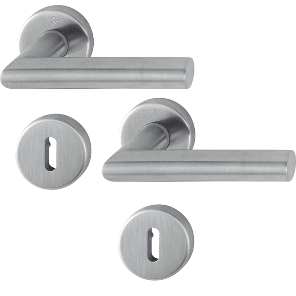HOPPE Amsterdam Binnendeurbeslag Rozettengarnituur E1400Z/42KV/42KVS SL RVS DD:37-42mm wordt compleet geleverd met RVS Deurkruk, Krukrozetten en Sleutelrozetten. De Rozetten worden geleverd met de benodigde bevestigingsmiddelen voor een deurdikte van 37-42mm.