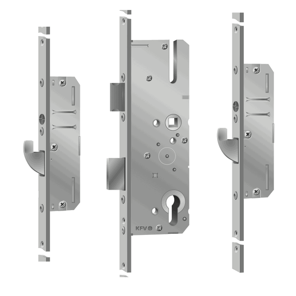 KFV Cilinderbediende meerpuntsluitingen in de serie AS-2502 zijn veelgebruikte driepuntssluitingen in de woningbouw. Deze meerpuntssloten zijn voorzien van haken die naar boven toe sluiten waardoor de deur kan zakken zonder effect op het slot. De sloten W267 en W268 zijn voor deuren tot 2400mm, voor deuren tot een deurhoogte van 2700mm kunnen de types W269 en W270 toegepast worden.