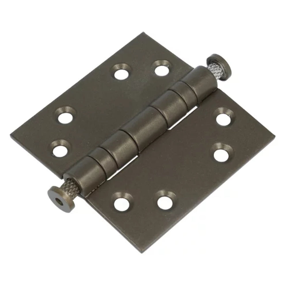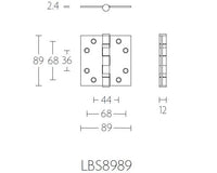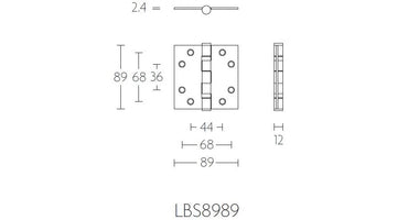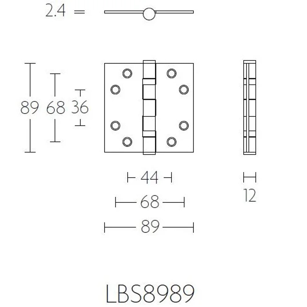 Dit kogellagerscharnier heeft rechte hoeken. De maat van dit scharnier is 89 x 89 mm en de dikte 2.4 mm. Het materiaal is mat roestvast staal met een bronzen coat.