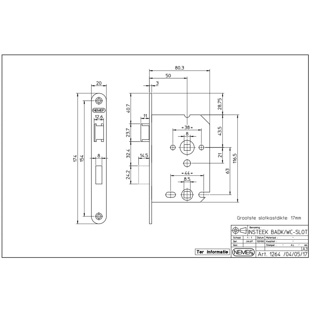 Het Nemef toilet-badkamer slot 1264 is speciaal bedoeld om de deur van een badkamer of toilet af te sluiten. Door de universele maatvoering, kan het bestaande slot eenvoudig vervangen worden zonder dat er schade aan de deur ontstaat.