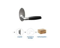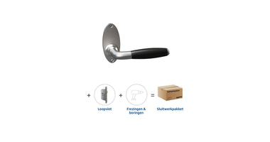 Het Foligno nikkel sluitwerkpakket met loopslot past uitstekend in een wat meer klassiek interieur. Het geborstelde nikkel en de zwarte handgreep geven een stijlvolle uitstraling die past bij verschillende deuren van Skantrae.