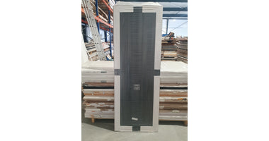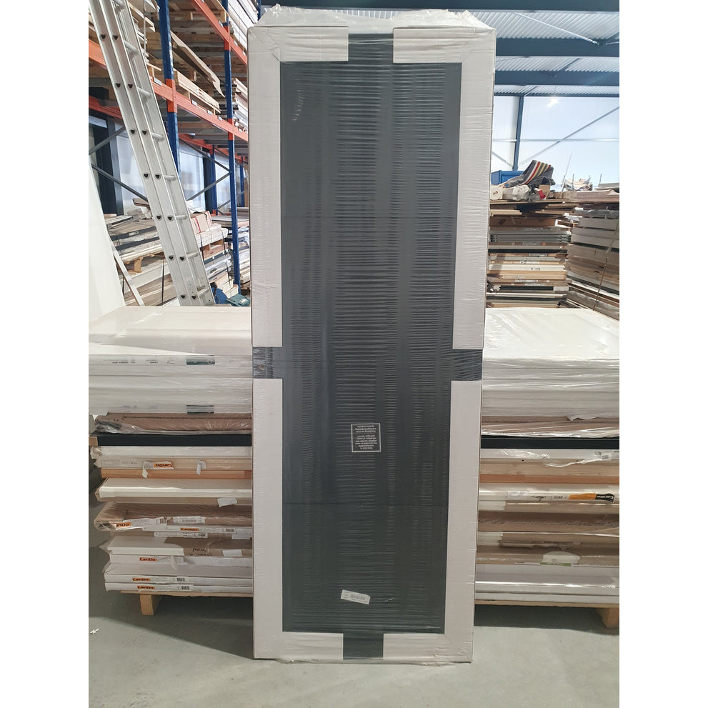 Deze moderne binnendeur heeft vlakke panelen met zeer dunne roedes en is zwart voorbehandeld.