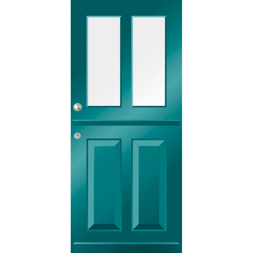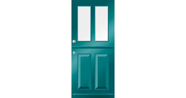 Hardhouten 2-ruits duetdeur. Keuze uit verschilende soorten glas. Standaard voorzien van witte voorlak. We lakken de deur graag perfect af in elke kleur waarbij je voor de binnenzijde een afzonderlijke kleur kan kiezen! Prijs exclusief glas, beslag, slotgat, hang- en sluitwerk.