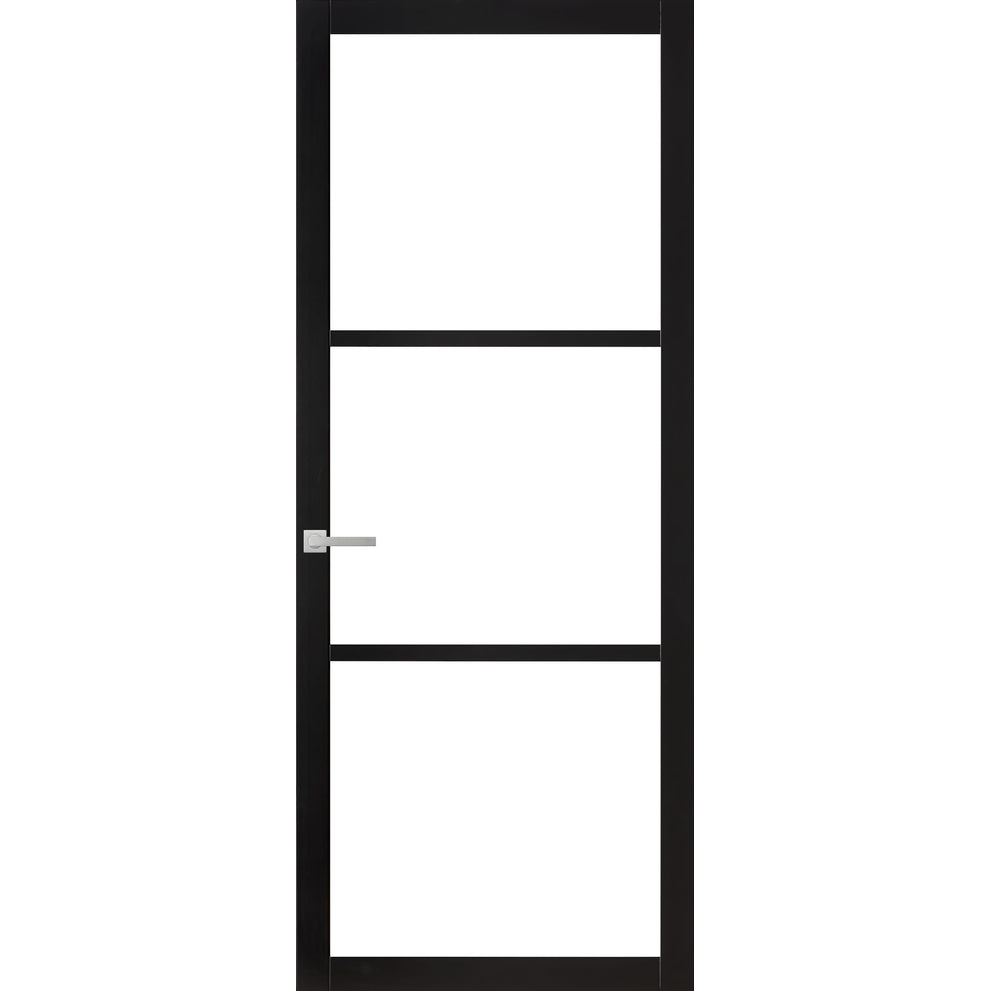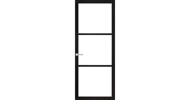 Industrieel design binnendeur. 3-ruits model met minimalistisch 80 mm frame. Basis van hout, schitterende steel look. Standaard zwart gegrond. Afgelakt in alle kleuren mogelijk. Prijs inclusief voorgemonteerd veiligheidsglas, exclusief beslag, hang- en sluitwerk.